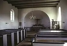 I apsisrundingen står alterbordet, som er muret af gule mursten. På alteret står et krucifiks, skåret af Hjalte Skovgaard. Døbefonten i granit er udført i romanske stilformer i nyere tid.
