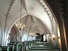 Koret har kalkmalerier fra 1740-50, udført af Viborg-maleren Mogens Trane. Prædikestolen er opsat i 1589 af ejeren af herregården Lundbæk, Christoffer Michilssøn Tornekrans og hustru Daaritte Juul.