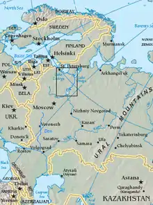 Volga-Østersøkanalen (i boksen), vist i forhold til hele Volga og dens forbindelser til det Kaspiske hav og Sortehavet.