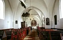 I sengotisk fik kor og skib indbygget krydshvælv. Altertavlen stammer fra en renæssance-fløjaltertavle med våben for Johan Rud og Anne Hardenberg, den nuværende altertavle blev kraftig omdannet i 1709 og fik tilføjet våben for Holger Pach og Lisbeth Bille, i fodstykkets maleri ses den jødiske og den kristne nadver. Korbuekrucifikset er fra sengotisk tid. Prædikestolen er fra 1700-tallet, på kurven ses naive malerier, på den firkantede lydhimmel ses evangelistmalerier. I stoleværket ses gavle med våben for Vogn Vognsen til Stenhede og våben for Malte Sehested og Sophie Brahe. I vestenden ses et pulpitur fra begyndelsen af 1700-tallet med våben for Pachs, Bille og Arenfeldt. I korets gulv ses en gravsten over Otto Brahe (død 1646).