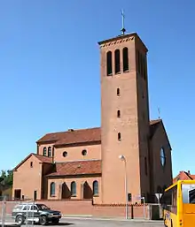 Kirken er bygget efter tegninger af den daværende domarkitekt i Aachen, professor J. Buchkremer, med montfortaner-ordenens hollandske ordensprovins som bygherre. Stilen er 1930'ernes, – med rig og tematisk anvendelse af den romanske rundbue.
