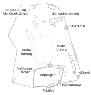 I slutningen af 1300-tallet fremstod den sandsynligvis med 9 fæstningstårne og 12 halvtårne, forbundet af næsten 800 meter fæstningsmur i 8 meters højde. De store fæstningstårne omfatter bl.a. Gåsetårnet, Ormetårnet, Jomfrutårnet, Valdemarstårnet og Møllebæktårnet - navne som dog først kendes fra 1600-tallet og frem.