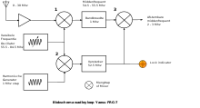 - blanding af den første oscillators signal med det modtagne signal i en elektronisk blander for at omsætte det ønskede signals frekvensinterval til en mellemfrekvens som er højere end radioforsatens højeste ønskede modtagne radiofrekvens,