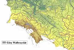 ![]() Kort over den vestlige del af Centralsudeterne med Waldenburgbjergene markeret med skravering