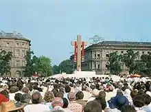 Johannes Paul 2.s besøgte sit hjemland i 1979 og 1983 bragte støtte til fagforbundet Solidarność og styrkede den voksende antikommunisme i Polen.[26] I 1979, mindre end et år efter han blev pave, ansporede Johannes Paul 2. til demokratiske ændringer under en messe i Warszawa, hvor han endte med at sige: Lad din Ånd stige ned! Lad din Ånd stige ned og forny landets skæbne! Dette land!.[26]