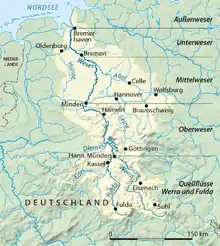Weser en af Tysklands hovedfloder. Den opstår ved foreningen af floderne Fulda og Werra ved Münden i den tidligere preussiske provins Hannover i en højde af 117 m over havet. Weser strømmer med mange bugter i en bred dal med nordlig og nordvestlig hovedretning gennem Weser-bjerglandet, hvis nordlige rand den gennembryder i den westfalske port oven for Minden. Den danner først for største delen grænsen mellem Hessen-Nassau og Hannover, skiller dernæst Westfalen fra Braunschweig, idet den berører byerne Beverungen, Höxter og Holzminden. Efter senere på en kort strækning at have skilt den tidligere fristat Lippe fra Westfalen træder den oven for Vlotho ganske over i denne, løber forbi Hausberge og Minden, oven for hvilken den træder ud i lavlandet, dernæst forbi Schlüsselburg, træder ind i Hannover, passerer Nienburg og Hoya, strømmer gennem fristaden Bremen og dens område og danner dernæst indtil sin udmunding i Nordsøen ved Bremerhaven grænsen mellem Oldenburg og Hannover.