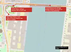 Westminsterangrebet blev udført den 22. marts 2017 på Westminster Bridge, Parliament Square og området ved Palace of Westminster. Gerningsmanden kørte en bil op på fortovet på Westminister Bridge, hvor 12 blev såret og en kvinde dræbt.[2][3][4][5] Derefter kørte han bilen ind i rækværket uden for parlamentsbygningen.[2] Gerningsmanden løb derefter mod parlamentets indgang, hvor han stak politibetjenten Keith Palmer[6] ihjel og blev skudt og dræbt af politiet.[2]