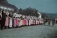 Etniske ungarere giver den nazistiske hilsen, mens de byder de ungarske tropper velkommen.