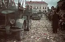 Folkemængder kaster blomster for at byde de ungarske tropper velkommen i Kézdivásárhely (Târgu Secuiesc)