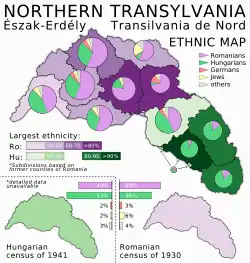 Det pågældende område dækkede et område på 43.104 km2, eller 43..492 km2 (afhængig af kilden). Den rumænske folketælling i 1930 registrerede for regionen en befolkning på 2.393.300. I 1941 gennemførte de ungarske myndigheder en ny folketælling, som registrerede en samlet befolkning på 2.578.100. Begge folketællinger spurgte sprog og nationalitet hver for sig. Ifølge de rumænske skøn i 1940 forud for Wien-diktatet var omkring 1.300.000 mennesker eller 50% af befolkningen rumænske, mens der ifølge de ungarske skøn i 1940 kort efter Wien-diktatet var omkring 1.150.000 mennesker eller 48% af befolkningen var rumænsk. [7] Resultaterne af begge folketællinger er opsummeret i denne tabel: