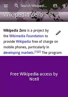 - "Wikipedia Zero arrives in Nepal via Ncell and you don't have to pay a Paisa to use it". Arkiveret fra originalen 12. juli 2014. Hentet 2014-05-19.