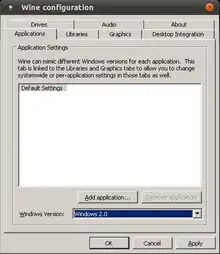 winecfg er et grafisk konfigurationsværktøj, de er inkluderet i Wine. Winecfg gør det muligt at konfigurere Wine hurtigere end gennem registrene. Dette kan dog gøres med en register editor, der minder om Windows' regedit. Wine tillader også egen åben source implementeringer af andre Windowsprogrammer så som notepad, wordpad, control, iexplorer og explorer.
