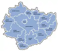 Święty Krzyż voivodskab er inddelt 14 distrikter (powiat): 1 bydistrikter og 13 landdistrikter. Disse er underopdelt i 112 gmina.