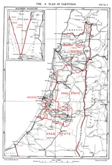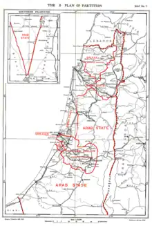 - En arabisk stat på 7.393 kvadratkilometer, der i store træk bestod af det som vi i dag kender som Vestbredden og Gazastriben. Desforuden bestod staten af en bred korridor, der forbandt disse landområder. Ligeledes ville den arabiske stat også omfatte byen Jaffa . Befolkningen ville indledningsvis bestå af ca. 8.900 jøder og 444.100 arabere.