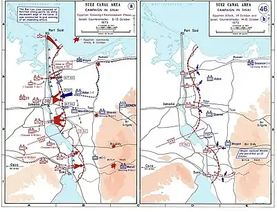 Den 143. panserdivision under generalmajor Ariel Sharon og Adans 162. panserdivision angreb den egyptiske front lige nord for den Bittersøerne i nærheden af Ismailia. Israelerne slog til mod et svagt punkt i den egyptiske linje – sammenføjningen mellem den egyptiske 2. armé mod nord og den 3. arme mod syd. I løbet af tre dage med nogle af den mest voldsomme kampe i krigen i Slaget ved Den Kinesiske Farm (et overrislingsprojekt øst for kanalen og nord for overgangsstedet) åbnede israelerne et hul i den egyptiske front og nåede frem til Suez-kanalen. Foran den israelske hovedstyrke krydsede en brigade faldskærmstropper under ledelse af oberst Danny Matt Suez-kanalen tæt fulgt af 30 kampvogne i de første timer af den 16. oktober, uden at møde modstand, og efterfølgende etablerede de et brohoved, der var 5 km dybt. Brigaden var afskåret fra de israelske enheder i næsten 24 timer mens slaget fortsatte ved Den Kinesiske Farm. En egyptisk infanteribrigade indledte et angreb om morgenen den 16. oktober, som nåede frem til ca. en kilometer fra kanalen, inden voksende tab tvang brigaden til at trække sig tilbage. Sharon sendte enheder ud for at slå til mod SAM enheder, og selv om kun omkring 3 batterier blev ødelagt, besluttede den egyptiske ledelse at trække alle de resterende batterier tilbage til mere sikre stillinger, hvilket mindskede deres effektivitet og gjorde det muligt for det israelske luftvåben at yde støtte til tropperne på jorden.[54][55][56]