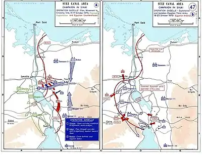 Inden krigen ville intet vestligt land levere broslagningsudstyr til israelerne af frygt for at israelerne ville krydse kanalen. Det lykkedes dem at købe og restaurere forældede modulære ponton broer på en fransk skrammelplads med udstyr fra 2. verdenskrig. Israelerne byggede også en temmelig avanceret "rulle bro", men logistiske forsinkelser som følge af trafikpropper på vejene til overgangsstedet forsinkede dens ankomst til kanalen i adskillige dage. Indsættelsen af pontonbroen skete om natten mellem den 16. og 17. oktober og Adans 162. division krydsede kanalen om natten mellem den 17. og 18. oktober. En egyptisk faldskærmsbrigade, som havde styret en effektiv artilleribeskydning mod det israelske overgangsområde, blev tvunget nordpå af Sharons division, indtil de ikke længere kunne se overgangsområdet. De reducerede det egyptiske artilleris effektivitet, og om morgenen den 19. oktober placerede israelerne deres 2. bro over kanalen, selv om opfangede radiomeddelelser fortsatte med at indikere kraftige israelske tab. Sharons division med en faldskærms- og tre panserbrigader fortsatte med at rykke frem nordpå i et forsøg på at erobre Ismailia og afskære 2. Armés hovedforsyningslinje. En kombineret styrke bestående af to faldskærmsbrigader og en pansret brigade stoppede dette fremstød 10 km syd for Ismailia i fire dages kamp mellem den 18. og den 22. oktober hvor de tilføjede de israelske pansertropper og Matts faldskærmstropper store tab. I mellemtiden var Adan, som havde krydset kanalen den 17. oktober fortsat sydpå med henblik på at afskære den egyptiske tredje armé. Ved krigens slutning var israelerne et godt stykke inde i Egypten, hvor de nåede 101 km stenen fra hovedstaden Cairo.[56][57][58]
