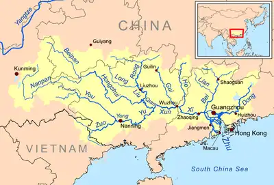 Perlefloden forener tre store floder, Xi Jiang, Bei Jiang og Dong Jiang. Flodens afvandingssområde omfatter det meste af provinserne Guangdong, Guangxi, Yunnan og Guizhou, og dele af Hunan og Jiangxi, i alt et område på 409.480 km².