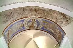 Over korbuen har man i 1997 fundet rester af en udsmykning. En figur i mandorla sidder frontalt omgivet af personer, formodentlig apostle. Kalkmalerierne er ret medtagne og skal udforskes i 1998, men man er foreløbig nået frem til, at det ikke er en dommedagsmajestas eller en Traditio Legis (Nøgleoverrækkelsen), muligvis er det pinseunderet. I nichen til det tilmurede østvindue er afdækket spor af romanske kalkmalerier. I toppen kan man ane en figur muligvis med korsglorie. Over hvælvene kan man se fragmenter af den romanske udsmykning.
