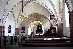Den oprindelige korbue er bevaret. Kor og skib har fået indbygget hvælv i slutningen af 1400-tallet. Altertavlen er en nygotisk ramme med et maleri af Th. Jensen fra 1867. Prædikestolen er fra nyere tid.