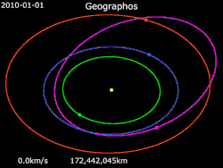 Geographos kredser om Solen i en meget aflang bane (0,8 - 1,7 AE, ecc: 0,34), hvilket bringer den rundt om Solen hvert 506. døgn (1 år og 5 mdr.) Udover at passere tæt forbi Jorden kommer Geographos også fra tid til anden tæt på Mars. Asteroiden har en absolut størrelsesklasse på 15,6 og roterer om sig selv på 5 timer og 13 min.