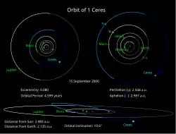 Ceres blev opdaget den 1. januar 1801 og blev i starten opfattet som en fuldgyldig planet. I løbet af de efterfølgende år blev der opdaget et stort antal andre himmellegemer i samme område som Ceres, og efterhånden opgav man tanken om, at Ceres var en rigtig planet. I stedet blev den lidt forvirrende betegnelse "asteroide" indført for disse nye objekter. Ceres roterer en gang rundt om sin egen akse på ni timer, og det tager 4,6 år for Ceres at fuldføre et omløb omkring Solen. Ceres bane befinder sig mellem 2,6 og 3 AU fra Solen