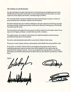 - ↑ "Full text of the Abraham Accords signed by Israel, the UAE and Bahrain". The White House. 16. september 2020. Arkiveret fra originalen 2020-10-13. Hentet 2020-09-25.