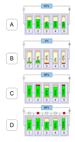 (B) Akkumulatorpakken er blevet afladet efter en rettesnor f.eks. 5*0,8V (NiMH) hvor "5" er er antallet af celler. Bemærk at celle 3 og 5 er blevet opladet med forkert polaritet - det er dét de -10% står for! Opladningen med forkert polaritet skyldes at en given celle undervejs er blevet helt afladet - herefter har de andre i fællesskab opladet celle(n eller rne) med forkert polaritet. Opladning med omvendt polaritet sænker levetiden drastisk for de berørte celler - og dermed akkumulatorpakken.