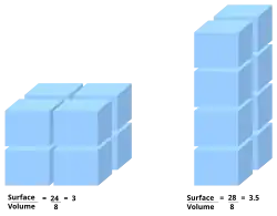 Diagrammet til højre viser to rektangulære prismer, der hver består af otte terninger. Hver terning indeholder en kubisk volumenenhed og hver af overfladerne af terninger er et kvadrat arealenhed. Et rektangulært prisme, der er to terninger bred, en terning lang og fire terninger høj vil have et volumen på 8 enheder og et overfladeareal på 28 enheder2. Et sammensat terning, der er to terninger bred, to terninger lang og to terninger høj vil have den samme volumen på 8 enheder men et overfladeareal på kun 24 enheder2.