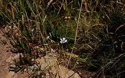 Toårig hør (Linum bienne) på Korsikas kyst. Billedet giver et indtryk af hørrens oprindelige tilpasning. Læg mærke til naboplanten: flyvehavre.
