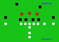De 11 spillere på forsvaret inddeles i linemen, linebackers (LB) og defensive backs (DB). Den almindeligste opstilling kaldes 4-3 forsvar. Den har 4 linemen (2 tackles og 2 defensive ends), 3 LB og 4 DB (2 cornerbacks og 2 safeties).