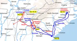 I mellemtiden rykkede Sherman fra Chattanooga til Atlanta, mens han undervejs besejrede de konfødererede generaler Joseph E. Johnston og John Bell Hood. Erobringen af Atlanta,[90] den 2. september 1864 var en betydningsfuld faktor for genvalget af Lincoln som præsident.[91] Hood forlod Atlantaområdet for at genere Shermans forsyningslinjer og invadere Tennessee i Franklin-Nashville kampagnen.[92] Unionens generalmajor John M. Schofield besejrede Hood i Slaget ved Franklin og George H. Thomas tildelte Hood et massivt nederlag i Slaget ved Nashville, som i praksis tilintetgjorde Hoods hær.