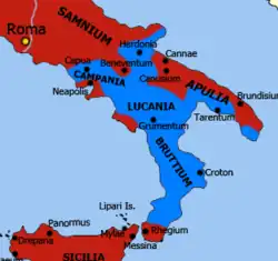 Det største tab var Italiens næststørste by, Capua, da Hannibals hær marcherede ind i Campania i 216 f.Kr. Indbyggerne i Capua havde begrænset romersk statsborgerskab, og aristokratiet var knyttet til romerne via ægteskab og venskab. Men muligheden for at blive Italiens førende by, efter de tydelige romerske katastrofer, viste sig at være en for stærk fristelse. Traktaten mellem dem og Hannibal kan beskrives som en venskabsaftale, da capuanerne ikke havde nogen forpligtelser.[128] Da havnebyen Locri faldt fra til Karthago i sommeren 215 f.Kr., blev den straks brugt til at forstærke de karthaginianske styrker i Italien med soldater, forsyninger og krigselefanter.[129] Det var den eneste gang under krigen, at Karthago sendte forstærkninger til Hannibal.[130] En anden styrke, under ledelse af Hannibals yngste bror Mago, var tiltænkt til at lande i Italien i 215 f.Kr., men blev omdirigeret til Iberien efter et stort karthaginiansk nederlag der.[129][131]