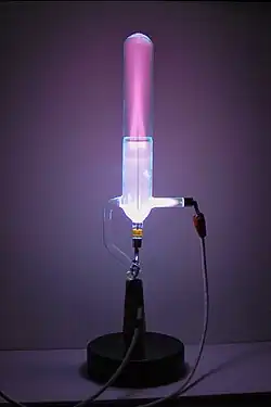 Når de positive ioner (anodestrålerne) passerer katoden, er ionerne accelereret så meget, at de ved sammenstød med atomer eller molekyler i gassen, ekciterer disses elektroner til højere energiniveauer - og kort tid senere afgives fotonere. Denne fotonproducerende proces, kaldes fluorescens, hvilket giver en lysglød i området hvor ionerne lige har passeret katodens perforering.