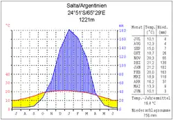 Argentina har et meget varieret klima[39] og strækker sig over flere klimazoner – der er områder der rangerer fra det tropiske i det yderste nordøst over subtropisk i resten af den nordlige del af landet og en udstrakt tempereret klimazone ned til de kolde klimaregioner i syden og i Andes.[40]