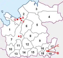 | # | Dansk navn | Russisk navn | Befolkning (2015 anslået)[3] | Administrativ inddeling Arkhangelsk oblast Novaja Zemlja og Franz Josefs Land er ikke på kortet | |