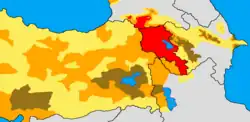 Armensk-befolkede områder i Anatolien og Transkaukasus i 1896. Stærkere blå farve viser regioner med højere armensk befolkning. De røde tal viser procentdelen af armeniere i hver enkelt region