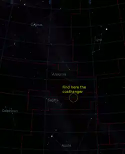 ![]() I det lille stjernebillede Ræven kan man i kikkert se dette syn. Ti stjerner danner en tøjbøjle. Bredden af de seks stjerner, som næsten ligger på linje, er 1.3°. Asterismet betegnes også Brocchis stjernehob. Men målinger udført med Hipparcos-satellitten viser, at de ti stjerner ikke er bundet sammen af den indbyrdes gravitation og derfor ikke danne er hob. Stjernernes størrelsesklasser varierer fra 5.16 til 7.11 |