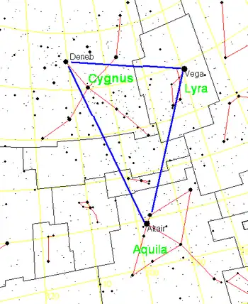 De lysstærkeste stjerner i stjernebillederne Lyren, Svanen og Ørnen danner en markant ligebenet trekant, som vender spidsen nedad, Sommertrekanten. Den ses højt på himlen sommer og efterår. De tre stjerner har meget forskellige afstande og lysstyrker, men næsten samme størrelsesklasse.