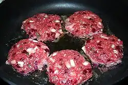 Ingredienserne minder om tatar, der imidlertid ikke steges, eller pariserbøf, hvor det kun er kødet, der steges til en hakkebøf og serveres med det øvrige som tilbehør.
