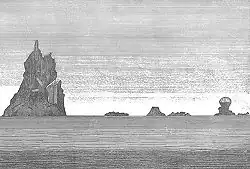 Der ligger omkring fire mil fra sydvestdelen af pyramiden, en farlig klippe, som kun viser sig lidt over vandoverfladen, og den ser ud til ikke at være større end en båd. Løjtnant Ball havde ikke mulighed for at udforske om det var sikkert at passere imellem dem eller ej.[3]