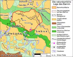 Plateauets sydlige grænse er markeret af Berlin-dalen, som floden Spree løber igennem. Mod vest er grænsen mellem Barnim og Glien-plateauet markeret af en nord-sydgående glacialdal. Mod nord og nordøst er grænsen til Eberswald-dalen, og i øst Lubusz Land.