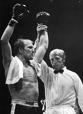 ![]() Bosse Högberg efter sejr over Werner Munddt på progala i Stockholm den 1. juli 1966. | |