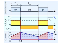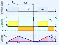 • i transistor off-tilstanden (diode on), er S ikke-ledende og så længe der er energi lagret i spolens magnetfelt, vil dioden lede spolens genererede strøm til kondensatoren og belastningen R. Dette sker over tidsinterval [D*T;(D+δ)*T[