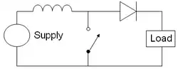 Et forsimplet diagram af en boost-konverter. Den aktive kontakt udgøres typisk af en MOSFET, IGBT eller BJT.