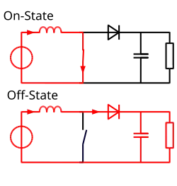 Figur 2: En boost-konverters to driftstilstande, når drevet i kontinuert strømdrift (CCM). Hvis diskontinuert strømdrift DCM vælges haves en tredje tilstand.