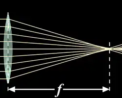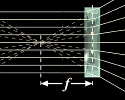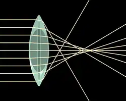 Illustrationen til højre viser hvordan parallelle lysstråler, der kommer ind i billedet fra venstre, bliver afbøjet i en sfærisk samlelinse.