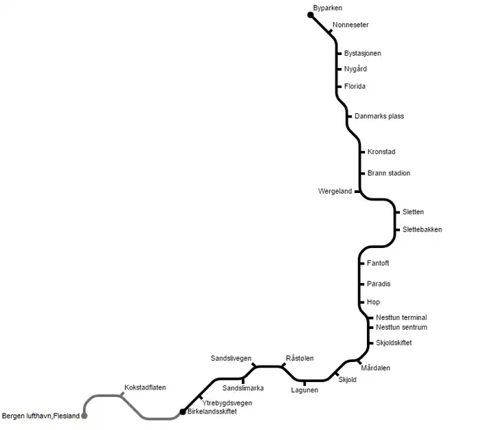 En anden etape er fra Nesttun til Lagunen (3,4 km) blev fuldført i juni 2013. En tredje etape til Bergen Lufthavn, Flesland blev taget i brug i august 2016. Der planlægges også en fjerde etape vestover til Fyllingsdalen via Kronstad og Minde.