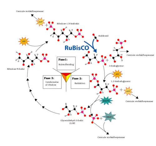 Dette gendannes til ribulose-1,5-bisfosfat gennem en lang række processer. Samtidig opstår der et overskud af 3-fosfoglycerat, der er udgangspunktet for dannelsen af sukker, stivelse, aminosyrer og fedtsyrer. 3-fosfoglycerat omdannes via dihydroxyacetonefosfat til hexosefosfater via reaktioner, der er analoge med glukoneogenesen.