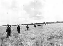 ![]() Indfødte fra Salomonøerne viser vej for amerikanske marinesoldater, som forfølger japanske styrker på Guadalcanal i november 1942 |
