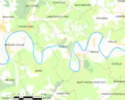 Kort over kommunen; Château de Cayx ligger ved floden, over for Parnac